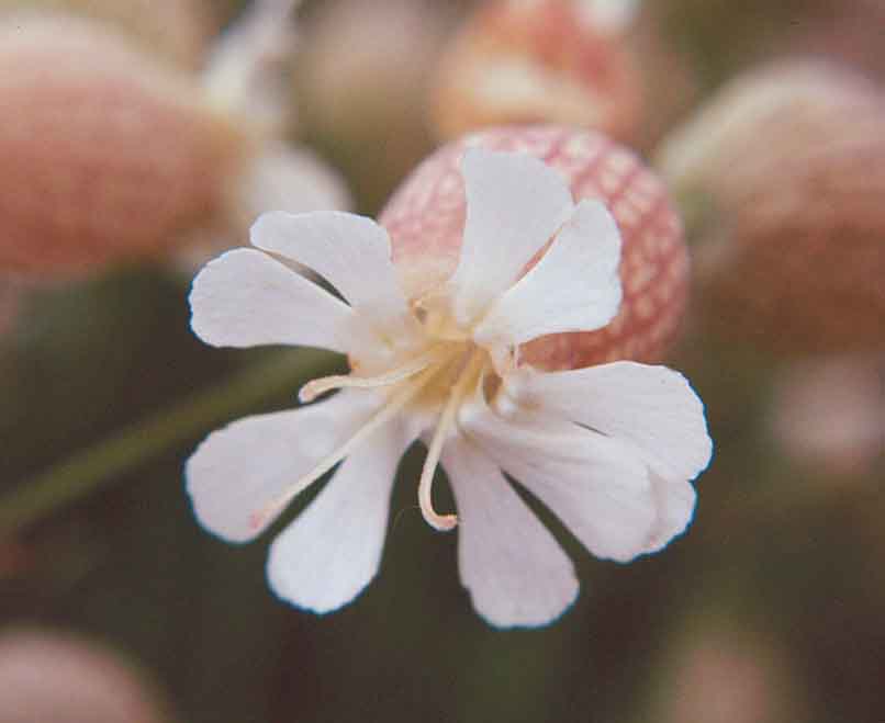 This white campion species has has striking, white flowers held on deilcate stems above fleshy green leaves. It gets its name from its bladder shaped calyx (the structure below its petals) – a feature it shares with its close relative; Sea Campion. The bladders and fine stems give the impression of bubbles floating abovce the plant. As a wildflower happy in maritime conditions its is tolerant of salt spray and found in sunny, exposed places. It is taller than Sea Campion