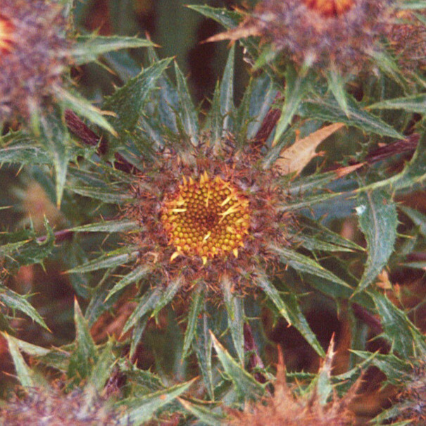 Carline Thistle is a striking plant with spiky green leaves and unusual straw textured flowers. Found in the wild on light, sandy soils in sunny places in coastal Scotland, it is a biennial attractive to bees. Up to 30cm tall.